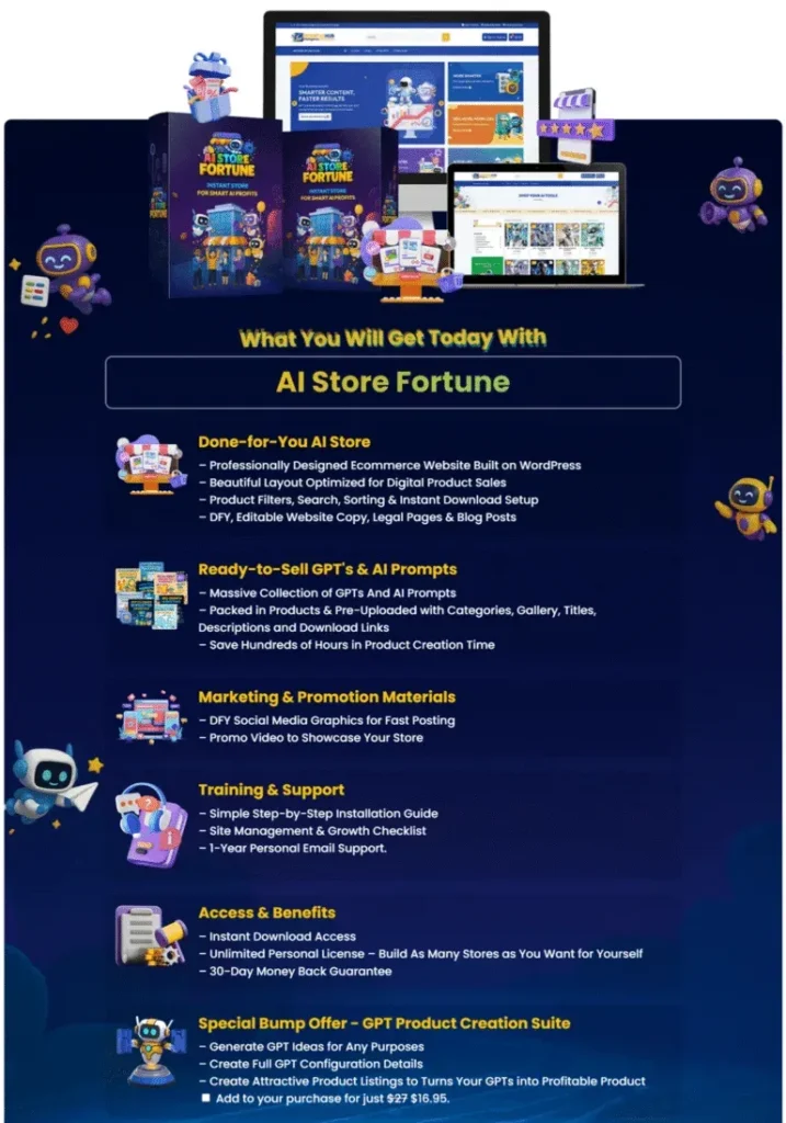 AI Store Fortune is a smart solution for beginners and marketers who want to cash in on the growing AI niche without building a store from scratch. With hundreds of GPTs and thousands of prompts preloaded, plus a fully functional storefront, you can start selling almost instantly.